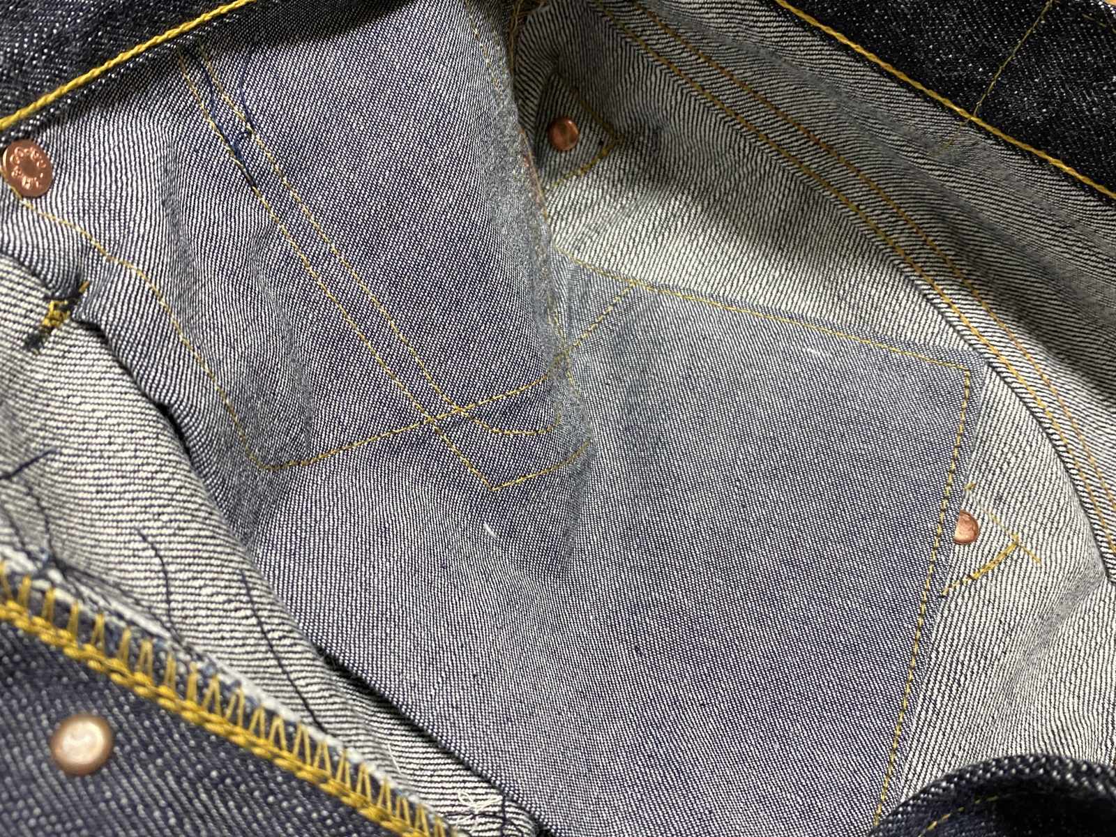 通常、大戦時モデルのポケットにはヘリンボーンやネル生地が用いている事が多いですが、こちらのコラボジーンズはデニム生地を採用しております。