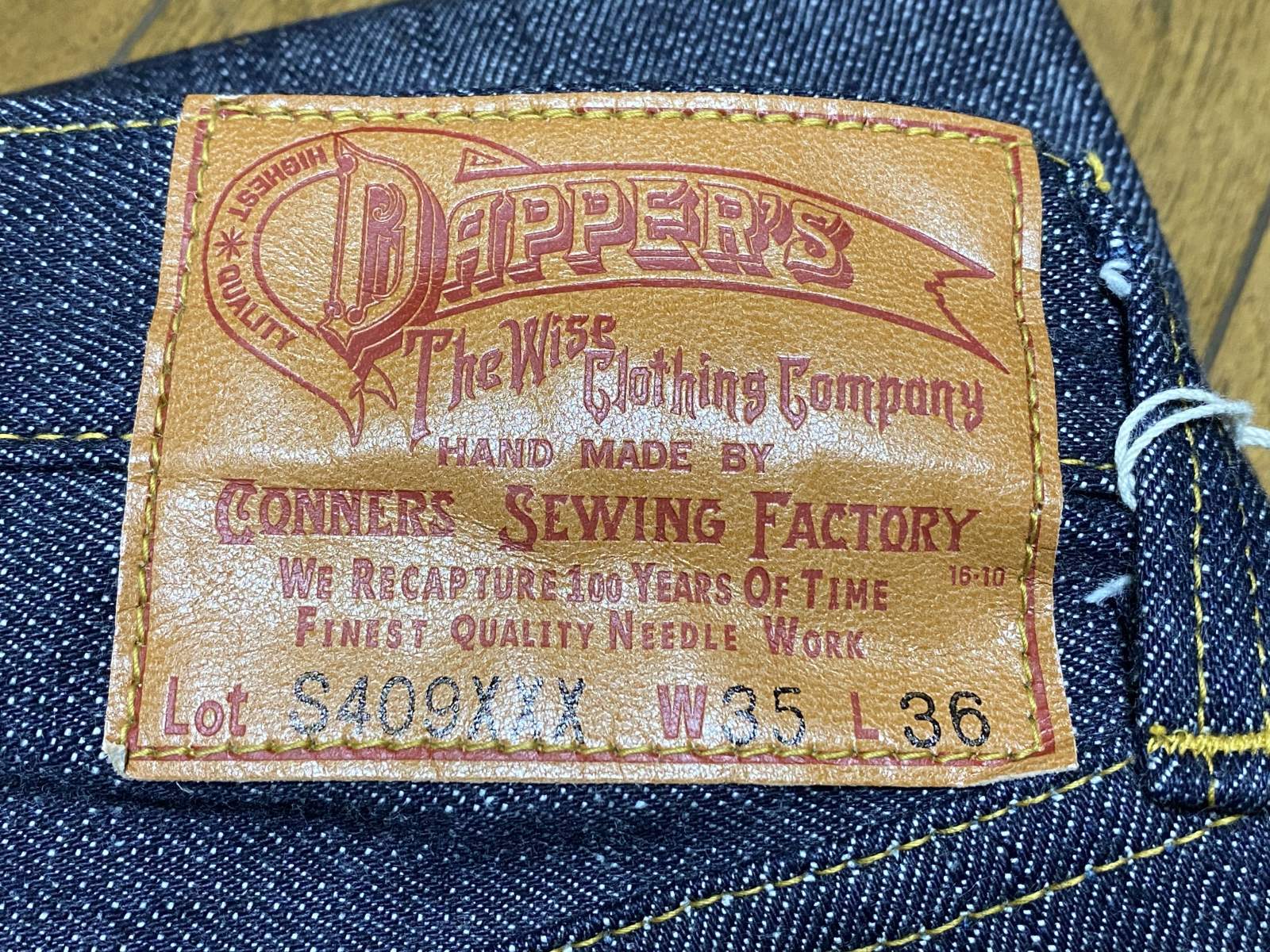 ロットナンバー、S409XXが印字されたジーンズにはダッパーズとコナーズのネームが印字された専用の革パッチが用いられております。