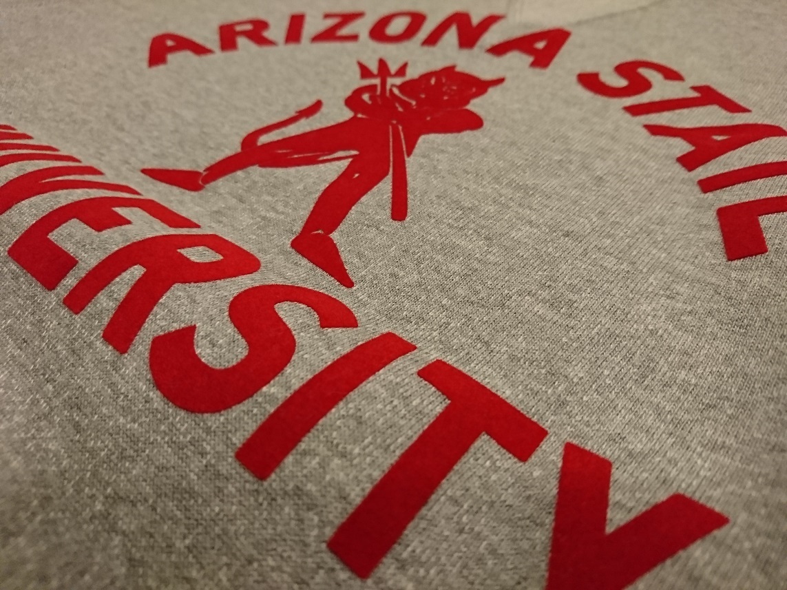 クッシュマンの定番スエット(26901)に、カレッジモチーフのプリントスウェットに良く見られるフロッキープリントが施されたスウェットです。